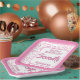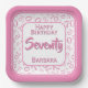 This over-the-hill design has a pink and white random number pattern with milestone number 70 repeated in varied sizes and angles. There is a white rounded square in the center for your text and pink and white around the rim.