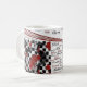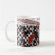 Red/black/white mug. Chinese characters: honest, faith, love.