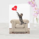Tabby cat standing on a leather chair playing with a red heart balloon for 71st birthday.