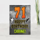 The front of this scary and spooky Hallowe’en themed birthday greeting card design features a large number “71”. It also features the message “HAPPY BIRTHDAY,”, plus a customizable name. There are also depictions of a bat and a ghost on the front. The inside features an editable birthday greeting message, or could perhaps be cleared and left blank if a message is to be written by hand instead. A customizable birthday card like this might be a fun way to acknowledge somebody’s seventy-first birthday that also falls on Halloween (October 31st). [~Z0000547]