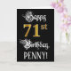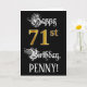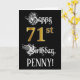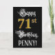 The front of this fancy and elaborate birthday-themed greeting card design features the message “Happy 71st Birthday,”, and a customizable recipient name. Part of the message is in a lavish script-style text. The large number “71st” features a faux/imitation gold-inspired look pattern. The background is colored black. The inside has a custom birthday greeting message, or could perhaps be cleared and left blank if a message is to be written by hand instead. A luxurious, personalized birthday greeting card like this might be a respectable way to deliver some birthday wishes to somebody who is celebrating their seventy-first birthday. [~Z0000559]