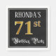 This luxurious and fancy birthday paper napkin design features a customizable name and the message “71st Birthday Party”. The large number “71st” has an imitation/faux gold-inspired coloring pattern, the words “Birthday Party” are in ornate script-style text, and the background is colored black by default (although it can be customized). Elegant, ornate paper napkins like this might be useful at a birthday celebration/party being held to honor somebody’s seventy first birthday. [~Z0000565]