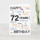 Let's commemorate the incredible 72nd birthday milestone with our delightful Happy 72nd Birthday card! Whether it's for your cherished mom, beloved dad, dear brother, or beloved sister, this card provides a lovely avenue to express your heartfelt wishes and shower them with joy and love on their special day. The front of the card proudly displays "Happy Birthday" alongside the significant number 72, depicted in decades, years, months, weeks, days, hours, minutes, and seconds, underscoring the significance of this momentous occasion.