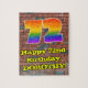 This exciting and fun urban street art and graffiti inspired birthday jigsaw puzzle design features a large number “72” with a colorful rainbow spectrum gradient inspired pattern, along with the message “Happy 72nd Birthday,”, and a personalized name. The background has a brick wall pattern. A colorful, personalized birthday puzzle like this might be used to acknowledge somebody’s seventy-second birthday. [~Z0000545]