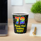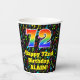 This colorful and exciting music-themed birthday paper cup design features a large number “72” having a rainbow spectrum gradient inspired pattern. It also features the message “Happy 72nd Birthday,”, and a personalized name. The background features a multicolored pattern having music notes and symbols of various sizes and colors. Vibrant, colorful paper cups like this might be fun to have at a birthday celebration being held to honor somebody’s seventy second birthday. [~Z0000541]