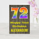 The front of this colorful yet rustic birthday-themed greeting card design features a large number "72" with a rainbow spectrum gradient inspired pattern, along with the message "Happy 72nd Birthday,", and a personalized recipient name. The front features a background depicting a rustic faux wood grain inspired pattern. The inside features a customizable birthday greeting message, or could perhaps be cleared and left blank if a message is to be written by hand instead. A customizable birthday card like this might be a fun way to send birthday wishes to somebody who is celebrating their seventy second birthday. [~Z0000419]