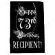 This formal and opulent birthday gift bag design features the message “Happy 73rd Birthday,” in fancy script style text, on a black colored background. It also features a customizable recipient name. An elaborate gift bag like this might be used when wrapping presents being given to somebody in celebration of their seventy-third birthday. [~Z0000557]