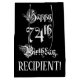 This elaborate and opulent birthday themed giftbag design features the message “Happy 74th Birthday,” in ornate script style text, on a black colored background. It also features a personalized recipient name. An elegant birthday themed gift bag like this might be a respectable way to wrap a gift or present being given to celebrate somebody’s seventy fourth birthday. [~Z0000557]