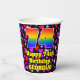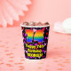 This joyful and colorful birthday themed paper cup design features a large number “74” with a rainbow spectrum gradient inspired pattern, along with the message “Happy 74th Birthday,”, and an editable name. The background features a pattern of pink, purple, and red heart shapes. Cheerful, happy paper cups like this might be fun to use at a birthday celebration being held to celebrate somebody’s seventy fourth birthday. [~Z0000548]