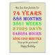 74th birthday card counting down the years, days, months, hours, and minutes. A card to give pause for thought! Leap years have been taken into account!