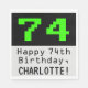 This fun and nerdy birthday paper napkin design features a large green vintage computer gaming style number "74" on a black colored background. It also features the birthday greeting message "Happy 74th Birthday,", and a name that can be personalized. Silly paper napkins like this might be useful at a party being held to celebrate the seventy fourth birthday of a scientist, a computer programmer, or somebody who really likes vintage computer games. [~Z0000404]