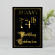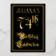 The front of this ornate, elegant, foil seventy-fourth birthday party/celebration invitation design features the message “74th Birthday Celebration” in luxurious script-style text. It also features a custom name. The background of the front is colored black by default (although it can be customized to a different color). The back features personalized details about the event, such as the date, time, location, and any other relevant information. Luxurious, opulent, customizable invitations like these might be used to invite guests to a birthday celebration/party being held to honor somebody’s seventy-fourth birthday. [~Z0000589]
