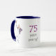 This white ringer mug, with dark blue lip and handle makes a great birthday gift for a 75 year old! The image, back and front is of an 'older man' dancing, in a blazer and boater hat, from a watercolour illustration by Judy Adamson. Between the two men is the text - 75 years young!
