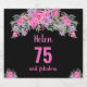 Elegant design for a 75th birthday party with a pink "75 & fabulous" and a scripted name, embellished by a feminine floral design on a black background. Customize name, age, text and background color.