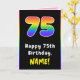 This upbeat and cheerful birthday greeting card design features the number “75“ having a vibrant multicolored rainbow spectrum inspired gradient pattern, along with the message “Happy 75th Birthday,”, and a personalized recipient name. The inside has a customizable birthday greeting message, or could perhaps be cleared and left blank if a message is to be written by hand instead. A fun, personalized birthday greeting card like this might be sent to celebrate somebody’s seventy-fifth birthday. [~Z0000627]