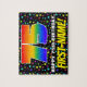 This exciting and upbeat birthday jigsaw puzzle design features a large number “75” having a multicolored rainbow spectrum inspired gradient pattern. It also features the message “HAPPY 75th BIRTHDAY,”, and a personalized recipient name. The background features a joyful, colorful stars pattern. A bold, editable birthday puzzle like this might be used to celebrate somebody’s seventy-fifth birthday. [~Z0000607]