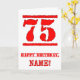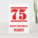 This fun birthday-themed greeting card design features a large red number “75” having a rubber stamp inspired look, in addition to the birthday greeting message “HAPPY BIRTHDAY,” and a personalized name on the front. The inside has an editable birthday greeting message, or could perhaps be cleared and left blank if a message is to be written by hand instead. A fun customizable birthday greeting card like this might be a fun way to send birthday greetings to somebody who is celebrating their seventy-fifth birthday. [~Z0000524]