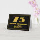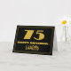 The front of this 1920s-1930s style inspired, vintage appearance birthday-themed greeting card design features a large art deco style inspired number "75", the message "HAPPY BIRTHDAY,", an editable name, and a border pattern consisting of lines. The front also has a black-colored background. The inside features a customized birthday greeting message, or could perhaps be cleared and left blank if a message is to be written by hand instead. A personalized birthday card like this might be a fun way to acknowledge somebody’s seventy fifth birthday. [~Z0000506]