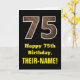 This rustic, fun birthday themed greeting card design features a large number "75" with a fake wood grain inspired appearance pattern on the front. The front also features the birthday greeting message "Happy 75th Birthday,", and a personalized recipient name. The inside features a customized birthday greeting message, or could perhaps be cleared and left blank if a message is to be written by hand instead. A customizable birthday card like this might be a fun way to send birthday wishes to somebody who is celebrating their seventy fifth birthday. [~Z0000433]