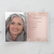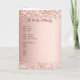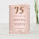 A gold gradient background with faux glitter. The name is written with a modern dark rose gold colored hand lettered style script. Number 75 is written with a balloon style font, script. Welcome text, photo, program and a biography on the back.