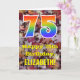 The front of this colorful, nature-inspired, and autumn-themed birthday greeting card design features a large number "75" with a rainbow spectrum gradient inspired pattern, along with the message "Happy 75th Birthday,", and an editable name. The front features a background depicting rustic fallen autumn leaves. The inside features a personalized birthday greeting message, or could perhaps be cleared and left blank if a message is to be written by hand instead. A personalized birthday card like this might be a fun way to acknowledge somebody’s seventy fifth birthday. [~Z0000384]