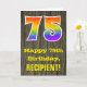 The front of this colorful yet rustic birthday-themed greeting card design features a large number "75" having a rainbow spectrum gradient inspired pattern. It also features the message "Happy 75th Birthday,", and a customizable recipient name. The background of the front of the card features a rustic faux wood grain appearance pattern. The inside features a customized birthday greeting message, or could perhaps be cleared and left blank if a message is to be written by hand instead. A personalized birthday card like this might be a fun way to send birthday wishes to somebody who is celebrating their seventy fifth birthday. [~Z0000419]