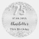 Faux silver looking background decorated with confetti. Personalize and add a date and a name. Black letters. 75 written with a balloon style font.