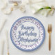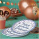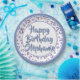 This over-the-hill design has a blue and white random number pattern with a blue milestone number 75 repeated in varied sizes and angles. There is a white circle in the center for your text and blue-and-white rings around the rim.