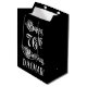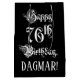 This opulent and luxurious birthday-themed gift bag design features the message “Happy 76th Birthday,” in formal script style text, on a black colored background. It also features a custom recipient name. An ornate gift bag like this might be used when giving a gift or present in honor of somebody’s seventy sixth birthday. [~Z0000557]