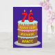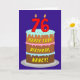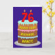 The front of this cheerful and joyful birthday themed greeting card design features a depiction of a three-tier birthday cake having numeral-shaped candles on top showing the number “76“, along with the message “HAPPY 76TH BIRTHDAY,”, and a personalized recipient name. The inside features an editable birthday greeting message, or could perhaps be cleared and left blank if a message is to be written by hand instead. An upbeat, customizable birthday greeting card like this might be used to acknowledge somebody’s seventy-sixth birthday. [~Z0000620]