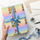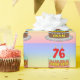 this fun and joyful birthday-themed wrapping paper design features a cartoon-style depiction of a three-tier birthday cake having numeral-shaped candles on top showing the number “76“, along with the message “HAPPY 76TH BIRTHDAY,”, and an editable recipient name. The background features a multi-color pastel rainbow spectrum inspired gradient pattern. Upbeat wrapping paper like this might be used when giving a gift or present in honor of somebody’s 76th birthday. [~Z0000622]