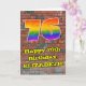 This exciting and fun urban street art and graffiti themed birthday greeting card design features a large number “76” having a multicolored rainbow spectrum gradient inspired pattern. It also features the message “Happy 76th Birthday,”, and a custom name. The background of the front features a brick wall pattern. The inside features a personalized birthday greeting message, or could perhaps be cleared and left blank if a message is to be written by hand instead. A colorful, customizable birthday greeting card like this might be sent to celebrate somebody’s seventy-sixth birthday. [~Z0000586]
