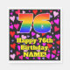 This happy and joyful birthday paper napkin design features a large number “76” having a rainbow spectrum gradient inspired pattern. It also features the message “Happy 76th Birthday,”, and an editable name. The background features a pattern of purple, pink, and red heart shapes of various sizes. Friendly, joyful paper napkins like this might be fun to use at a birthday celebration/party being held in celebration of somebody’s seventy sixth birthday. [~Z0000550]