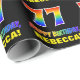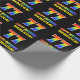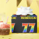 This cheerful, fun, and colorful birthday wrapping paper design features a large number "77" and the message "HAPPY BIRTHDAY,", both colored with a rainbow spectrum gradient inspired pattern, along with a bold yellow personalized recipient name. The background is colored black. Fun birthday themed wrapping paper like this might be used when giving a gift or present in celebration of somebody’s 77th birthday. [~Z0000475]