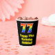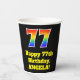 This exciting and fun birthday paper cup design features a large number “77” with a rainbow spectrum gradient inspired pattern, along with the message “Happy 77th Birthday,”, and an editable name. The background is colored black. Colorful, vibrant paper cups like this might be fun to have at a birthday party being held to celebrate somebody’s seventy seventh birthday. [~Z0000537]