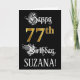 The front of this lavish and ornate birthday themed greeting card design features the message “Happy 77th Birthday,”, and a custom recipient name. Part of the message is in an opulent script-style text, the large number “77th” features a faux/imitation gold-inspired look pattern, and the background is colored black. The inside has a personalized birthday greeting message, or could perhaps be cleared and left blank if a message is to be written by hand instead. An elaborate, customizable birthday greeting card like this might be a respectable way to deliver birthday greetings to somebody who is celebrating their seventy-seventh birthday. [~Z0000559]