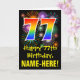The front of this fun, colorful, and exciting birthday themed greeting card design features a large number "77" with a rainbow spectrum gradient inspired pattern, along with the message "Happy 77th Birthday,", and a personalized recipient name. The front additionally features a colorful background pattern inspired by the look of bursting celebratory fireworks. The inside features a customized birthday greeting message, or could perhaps be cleared and left blank if a message is to be written by hand instead. A customizable birthday card like this might be a fun way to send a message celebrating somebody’s seventy seventh birthday. [~Z0000442]
