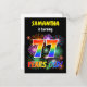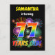 The front of this vibrant and lively birthday party invitation postcard design has a personalized name, a fun bursting celebratory fireworks inspired pattern, and the message "77 YEARS OLD!" having a colorful rainbow spectrum inspired gradient pattern. The back features a customizable message that could include details about the birthday party, such as when it is happening and where it is being held. Invitation postcards like this might be sent to potential attendees of a party being held to celebrate the birthday of somebody who is turning 77 years old. [~Z0000452]