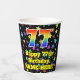 This cheerful and exciting birthday themed paper cup design features a large number “77” with a rainbow spectrum gradient inspired pattern, along with the message “Happy 77th Birthday,”, and a custom name. The background features an exciting and colorful star field inspired pattern. Vibrant, colorful paper cups like this might be fun to have at a birthday celebration/party being held in celebration of somebody’s 77th birthday. [~Z0000540]