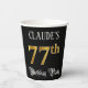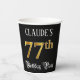 This luxurious and opulent birthday themed paper cup design features a custom name and the message “77th Birthday Party”. The large number “77th” has a faux/imitation gold-inspired coloring pattern, the words “Birthday Party” are in fancy script-style text, and the background is colored black by default (although it can be customized). Fancy, ornate paper cups like this might be useful at a birthday party/celebration being held to honor somebody’s 77th birthday. [~Z0000567]