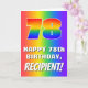 The front of this joyful and exciting birthday-themed greeting card design features a large number “78” with a rainbow spectrum inspired gradient pattern, along with the message “HAPPY 78th BIRTHDAY,”, and an editable name. The background of the front also has a cheerful multicolored rainbow spectrum gradient pattern. The inside has a customized birthday greeting message, or could perhaps be cleared and left blank if a message is to be written by hand instead. An upbeat, editable birthday greeting card like this might be used to celebrate somebody’s seventy-eighth birthday. [~Z0000570]