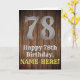 This country look and American Wild West inspired birthday greeting card design features a large rustic look number "78", the message "Happy 78th Birthday,", an editable name, and a faux/imitation wood grain inspired look pattern background. The inside has a customized birthday greeting message, or could perhaps be cleared and left blank if a message is to be written by hand instead. An editable birthday greeting card like this might be used to acknowledge somebody’s seventy-eighth birthday. [~Z0000469]