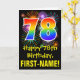 The front of this exciting, fun, and colorful birthday themed greeting card design features a large number "78" having a rainbow spectrum gradient inspired pattern. It also features the message "Happy 78th Birthday,", and a custom recipient name. The front additionally features a colorful bursting celebratory fireworks inspired background pattern. The inside features a customizable birthday greeting message, or could perhaps be cleared and left blank if a message is to be written by hand instead. A customizable birthday card like this might be a fun way to celebrate somebody’s seventy eighth birthday. [~Z0000442]