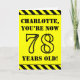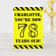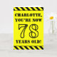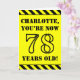 The front of this bold and attention-grabbing birthday themed greeting card design features an editable name and the message "YOU’RE NOW 78 YEARS OLD!" in black stencil style text on a yellow colored background. The front also features an eye-catching yellow and black stripes pattern at the top and bottom edges. The inside features a custom birthday greeting message, or could perhaps be cleared and left blank if a message is to be written by hand instead. A customizable birthday card like this might be a fun way to send a message in celebration of somebody’s seventy eighth birthday. [~Z0000413]