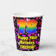 This joyful and cheerful birthday paper cup design features a large number “78” with a rainbow spectrum gradient inspired pattern, along with the message “Happy 78th Birthday,”, and a personalized name. The background features a pattern of heart shapes with colors like purple, red, and pink. Upbeat, fun paper cups like this might be fun to have at a birthday celebration being held to celebrate somebody’s 78th birthday. [~Z0000548]