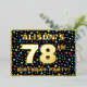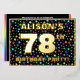 The front of this vibrant and eye-catching seventy-eighth birthday party/celebration foil invitation card design features a personalized name, a large number “78th”, the message “BIRTHDAY PARTY!”, and a border. The background of the front features a joyful, colorful pattern of star shapes. The back features personalized details about the event, such as the date, time, location, and any other information that may be important. Customized invitations like these might be a fun way to invite attendees to a birthday gathering/party being held to honor somebody’s 78th birthday. [~Z0000600]