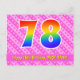 The front of this happy, upbeat, and fun birthday postcard design features a large number "78" with a rainbow spectrum gradient inspired pattern, along with the message "Happy 78th Birthday,", and a customizable recipient name. The front additionally features a cheerful light pink and dark pink striped pattern containing heart shapes. The back features a customized birthday greeting message, or could perhaps be cleared and left blank if a message is to be written by hand instead. A customizable birthday postcard like this might be a fun way to send a message celebrating somebody’s seventy eighth birthday. Postcards like this might also be used to invite guests to a birthday celebration being held for somebody who is turning 78 years old. [~Z0000449]
