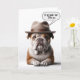 A bulldog is sitting calmly while wearing a stylish fedora hat isolated on a white background for a 79th birthday.