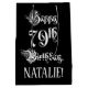 This elegant and elaborate birthday-themed gift bag design features the message “Happy 79th Birthday,” in luxurious script style text, on a black colored background. It also features a custom recipient name. A formal birthday themed gift bag like this might be a respectable way to wrap a gift or present being given to somebody who is celebrating their seventy ninth birthday. [~Z0000557]