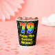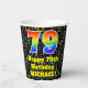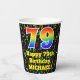 This joyful and cheerful music-themed birthday paper cup design features a large number “79” with a rainbow spectrum gradient inspired pattern, along with the message “Happy 79th Birthday,”, and an editable name. The background features an exciting and colorful pattern of various music notes and symbols having a variety of colors and sizes. Vibrant, colorful paper cups like this might be fun to use at a birthday celebration/party being held to honor somebody’s seventy ninth birthday. [~Z0000541]